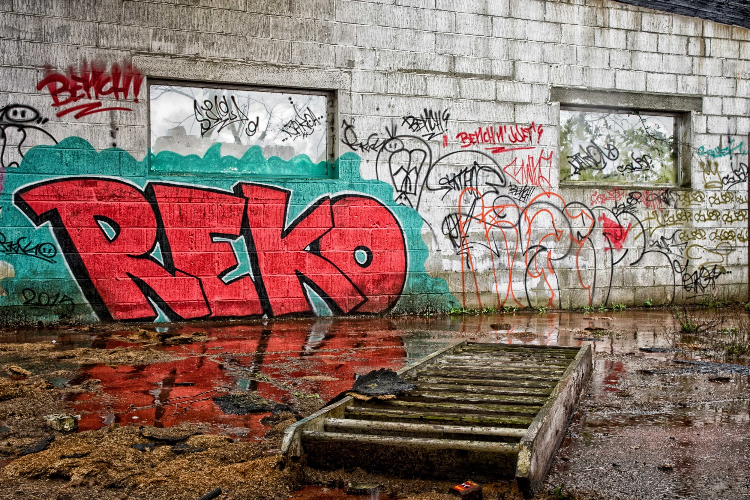 Urbex fotografie is niet zonder gevaar. Dit is een lege garage aan de kant van een drukke weg. Maar het is duidelijk dat ik niet de eerste bezoeker was.